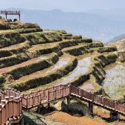 4分 满意2025/2/18来这里一日游。梯田规模不是很大,但是拍照还是很出片的,当然关键是一定要找个晴天,阳光赋予了梯田美丽的色彩和质感。景区不需要门票,还修建了栈道,让游客可以穿行在梯田中间,近距离观赏梯田,拍出各种美照。虽然这里是个小众的景点,景区交通不是很方便,但是这里漂亮的自然风光和淳朴的乡士气息,个人觉得这里值得到此一游。山上风大,晴天时紫外线很强,建议做好防护措施。