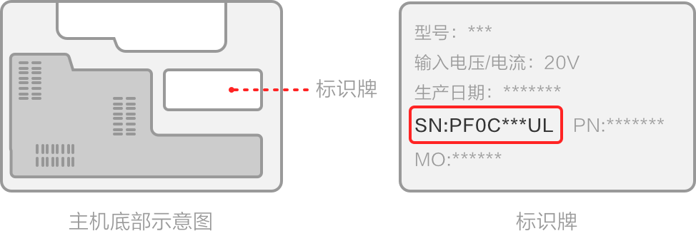 1.通过主机底部的标识牌查看主机型号和主机编号,部分主机编号可能在电池槽位置